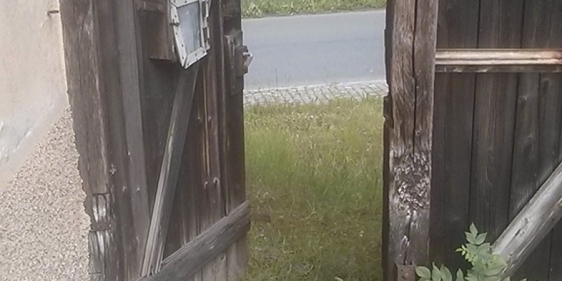 Das Hoftor zur Hauptstraße war durch den Vorbesitzer verammelt und zugeschraubt worden, da es zum einen baufällig war, zum anderen, um vor Einbrüchen zu schützen. Wir wollten aber wenigstens die Tür im Tor wieder gangbar machen, um auch mal, wenn auch meist nur für Wartungszwecke, zur Hauptraße raustreten zu können.