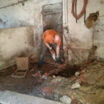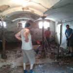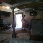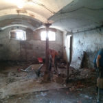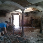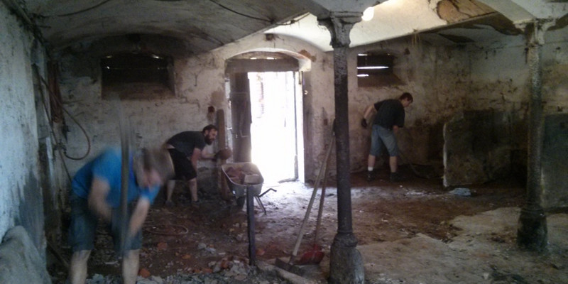 Der Raum ist mit etwa 75m² doch recht geräumig und durch das Gewölbe auch sehr urig und gemütlich. Er wird auch nach dem Umbau klar als ehemaliger Stall erkennbar sein. Zu Beginn der Entkernungsarbeiten sah er jedenfalls so aus, als ob die Kühe grad raus waren. Der Vorbesitzer teilte uns mit, dass hier wohl fürher gern mal 12 Kühe und ein paar Schweine drin gestanden hätten – unvorstellbar.
