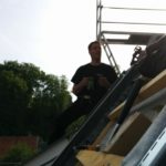 Der Bau des Daches ist für die erste Woche erstaunlich schnell vorangeschritten. Wo am Montag noch Dachpappe war, liegt jetzt Unterspannbahn, neue Lattung, neue Ortbretter,  Dachfenster und eine schöne neue Regenrinne.