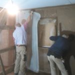 Alle Vorbereitungen waren getroffen, sodass die 3. Lage Lehm auf die Innenwände aufgebracht werden konnte. Fensterlaibungen wurden gespachtelt, Fensterbänke hergestellt und eingebaut und Gipsplatten an den Decken angeschraubt. Unser Lehmputzer meinte im Vorfeld noch, dass die Außentemperatur nicht so wichtig sei, da wir ja Wandheizung hätten, es sei denn, es wären 10 Grad minus.