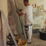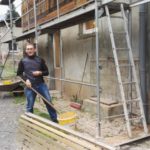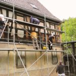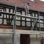 Am Wochenende begannen wir mit dem nächsten großen Schritt und hatten dafür viele Hände eingeladen. Die Hände gehörten zu den Mitgliedern des Hilfsvereins Samenkorn. Wie letztes Jahr schon einmal, waren sie auch dieses Jahr zu Gast bei uns und packten am Samstag ordentlich mit an. An der Hofseite stellten wir das Gerüst. Dann wurden die alten Putze an den Gefachen entfernt und diese mit Lehm wieder repariert. Zusätzlich montierten wir die neuen Bleche.