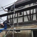 Ach nee, umgekehrt.  Nach genau einem Monat (zum Samenkornwochenende haben wir das Gerüst gestellt) sind wir nun, mit einigen Unterbrechungen mit der Sichtfachwerkfassade fertig geworden. Ein schönes Gefühl und eine schöne Fassade.