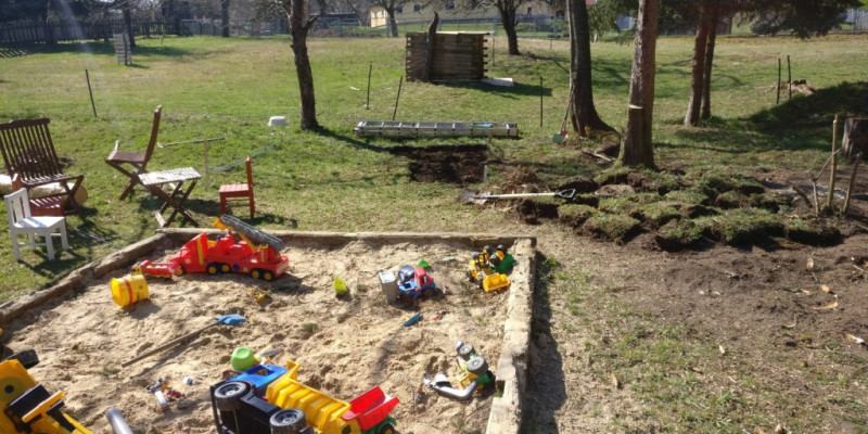 Und manchmal kommt dann noch etwas dazu, mit dem man gar nicht gerechnet hatte. Umgestürzte Bäume etwa. 5 Stück hatte es bei uns erwischt nach einem stürmischen Tag. Schade für den Baumbestand. Zugleich aber eine Chance der Umgestaltung. Nach dem ersten Aufräumen keimte die Idee den Sandkasten vielleicht nochmal zu versetzten? Und so kam es auch… An neuer Stelle und mit neuer Umrandung…