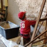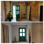 In einer großen Hauruck- Abrissaktion wurde der komplette Putz im Flur EG und im Treppenhaus nach oben abgehackt. Hier hat uns Wolfgang tatkräftig unterstützt. Im gleichen Zug wurde die Tür zum Versorgungstrakt nach hinten versetzt und die Teeküche und das GästeWC in den Flur integriert. Dann kam Andi und der Putz war in einer irren Geschwindigkeit wieder an der Wand. Ein Meilenstein, vor dem wir uns lange gedrückt haben.